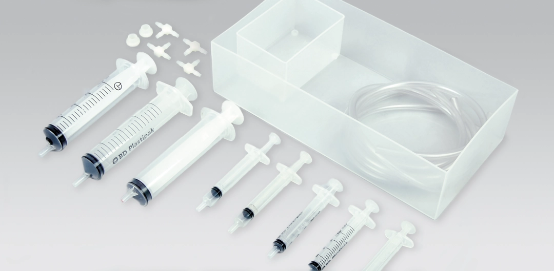 The Fluid Power Student Resource Pack (278-01) consists of a variety of syringes and connectors neatly contained in a plastic storage box.