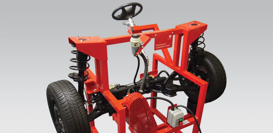 The Steering and Suspension System Trainer (764-01) includes all the individual components of the system presented on a moveable, steel frame so that each component can be clearly identified.