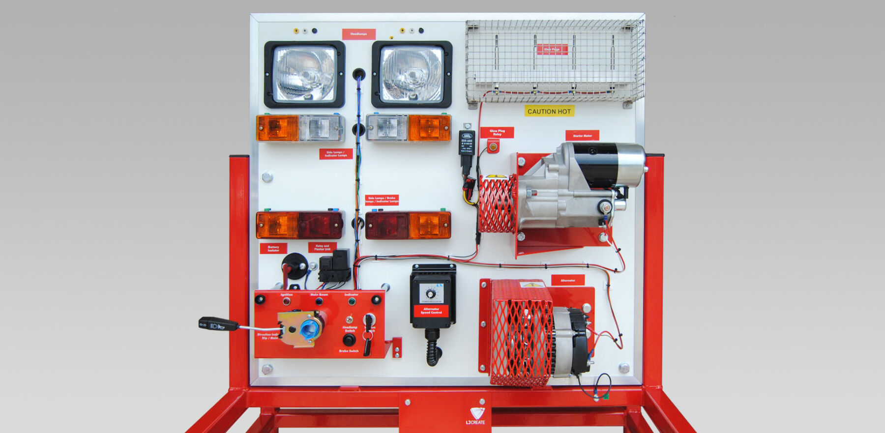 The 24 Volt Electrical System Trainer (770-02) features full operation of headlamps, side lamps, brake lamps, indicators, and alternator via a speed controller can be observed.