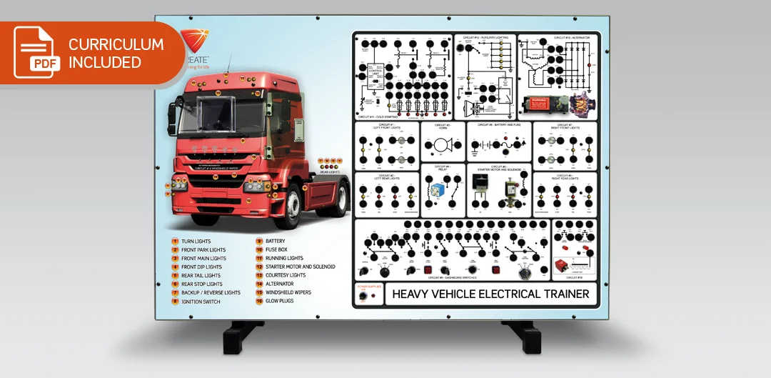 This trainer provides students and instructors with the opportunity to demonstrate, investigate and fault-find a simulation of typical diesel electrical systems. The trainer is designed to allow access to a variety of test points for vehicle electrical components, as well as provide an understanding of the overall system layout and configuration.