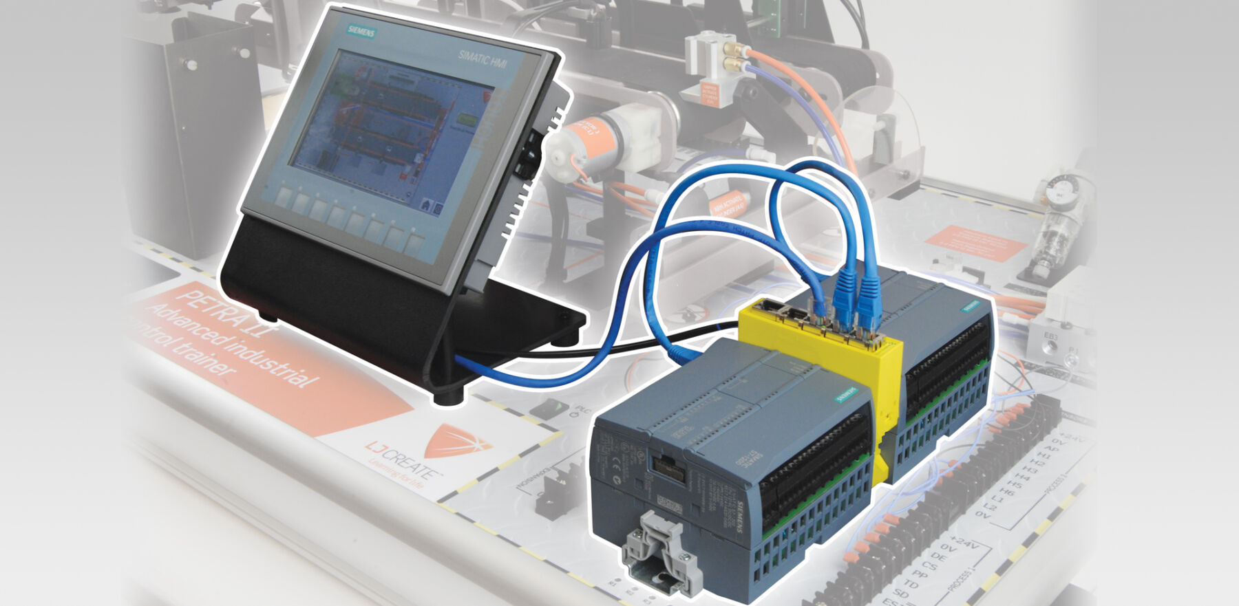 The PETRA II Advanced Industrial Control Trainer provides students with a complete, simulated (PLC-controlled) factory automation process. The PETRA II can be used with this Siemens HMI Pack - which links two PLC units together to control the factory automation process - an HMI panel is used to monitor and supervise the system.